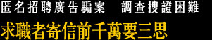 提示:求職者宜從可靠的招聘渠導搵工,網上討論區並沒有核實留言者的身份,一旦被騙,根本難以追查。 |